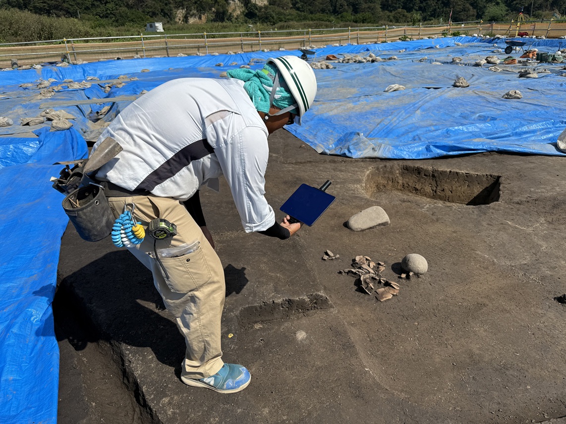従来の発掘調査では、専門の計測員が遺構等の位置を計測し、写真撮影や手書図面制作を行っていましたが、3次元スキャンを導入することで、専門の計測員でなくても現況の位置と状況を正確に記録でき、大幅な省力化が可能となります。