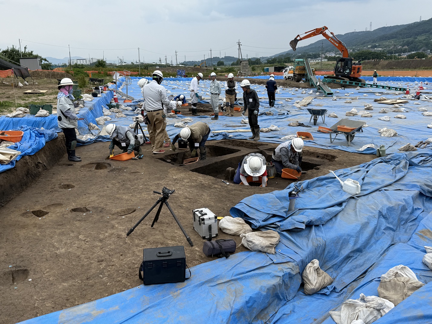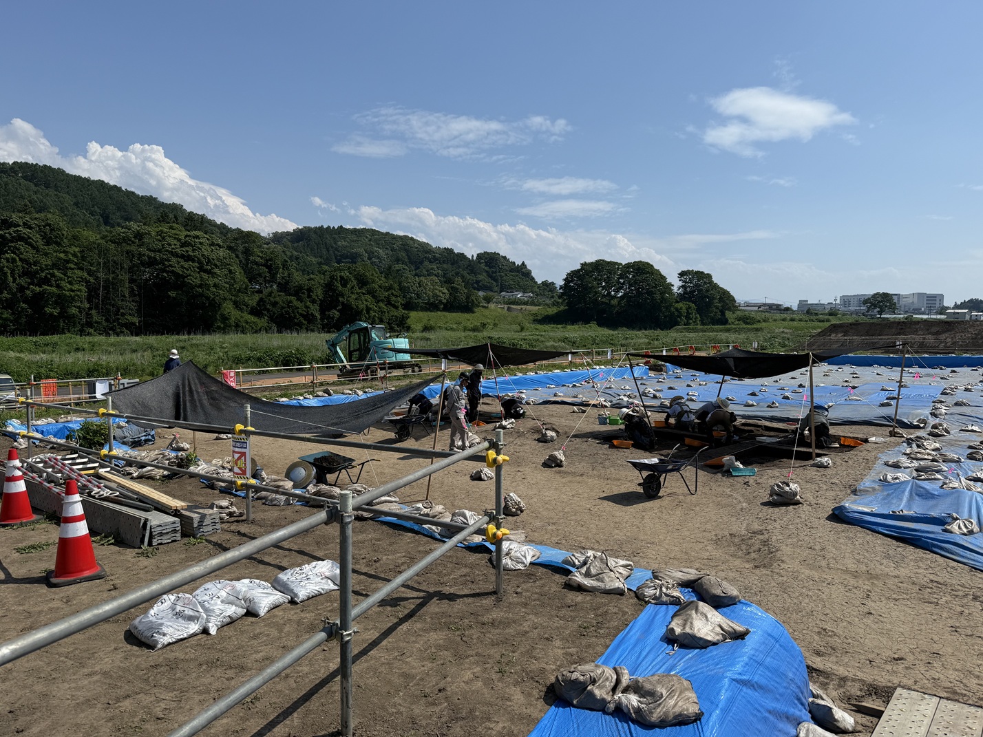 災害復旧や防災事業に伴う工事では、工事範囲が広大なため、埋蔵文化財が存在する可能性の高い「包蔵地」である場合があり、その際には大規模な発掘調査が必要となります。当協会では、こうした場合に行政機関等の要請を受け、会員企業と協力して発掘調査を受託しています。